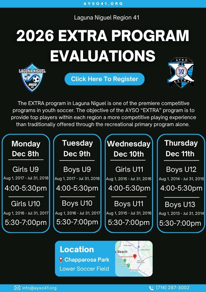 What is AYSO “EXTRA” The EXTRA program in Laguna Niguel is one of the premiere competitive programs in youth soccer. The objective of the AYSO “EXTRA” program is to provide top players within each region a more competitive playing experience than traditionally offered through the recreational primary program alone. Players participating in this program will compete against EXTRA Play teams from other regions and local area’s during the primary “Extra” season. Team formations start at 9U-14U for boys and girls.